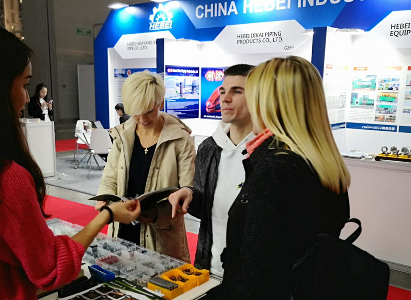 參展商到青龍劍展廳前咨詢產品詳情,本次展會由莫斯科大學博士后、中國最美志愿者徐琛全程翻譯。