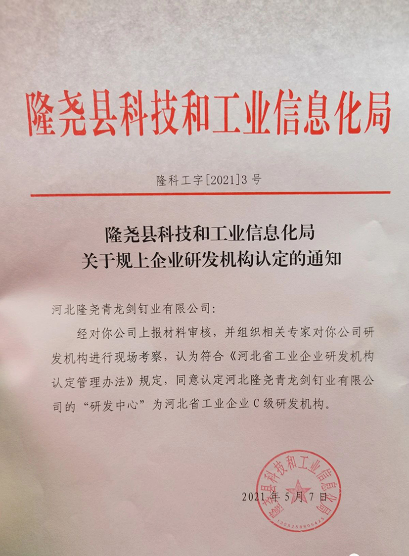 經(jīng)對你公司上報材料審核, 并組織相關(guān)專家對你公司研發(fā)機(jī)構(gòu)進(jìn)行現(xiàn)場考察, 認(rèn)為符合 《河北省工業(yè)企業(yè)研發(fā)機(jī)構(gòu)認(rèn)定管理辦法》規(guī)定,同意認(rèn)定河北隆堯青龍劍釘業(yè)有限公司的 "研發(fā)中心" 為河北省工業(yè)企業(yè)C 級研發(fā)機(jī)構(gòu)。