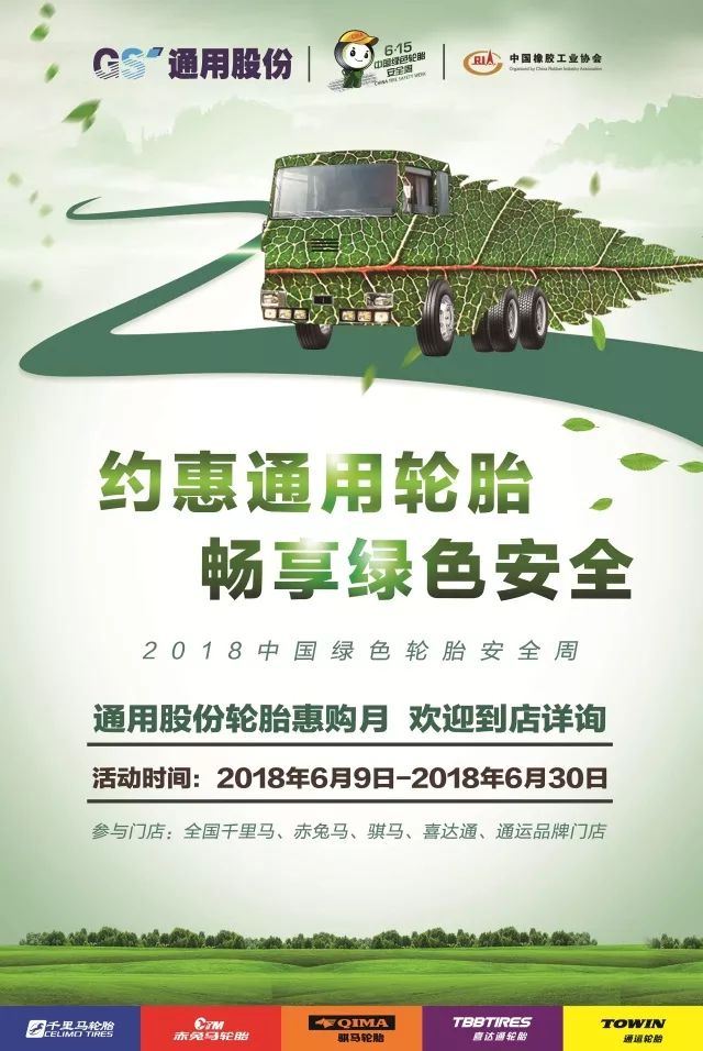 為了讓更多的普通消費者了解什么是綠色節能輪胎,輪胎標簽的作用,以及輪胎安全使用知識,同時也為了答謝消費者長期以來的支持,通用股份在全國通用品牌門店(千里馬、赤兔馬、通運、騏馬、喜達通)開展“約惠通用輪胎 暢享綠色安全”的輪胎惠購活動(2018年6月9日至6月30日),并采取滿減優惠、幸運抽獎、好禮相送等形式,以實實在在的優惠,與消費者共同擁抱安全出行。
