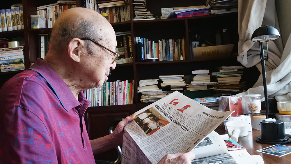7月29日,今年的七夕前夕,當代著名老詩人、作家、文藝評論家丁芒在家中認真錄制著對紅豆七夕節20周年的祝福視頻。中國當代詩壇曾有“北臧南丁”之說。丁芒,這位從南通城走出來的大詩人,從抗日戰爭的烽火開始生命的吟唱,80載筆墨為伴,書寫了萬余首激蕩人心的詩篇。面對記者的拜訪,丁芒和其夫人都十分熱情?,F已96歲高齡的他,看起來依舊面色紅潤,精神飽滿。在丁芒老先生家中,能夠感受到濃濃的文化氣息,書柜上、書桌上擺滿了各種書籍。雖然已是耄耋之年,丁芒老先生依然每天以書籍為精神食糧,在他的身上,我們看到了一個詩人對詩詞的忠貞和熱愛,對傳統文化的敬畏和崇拜。